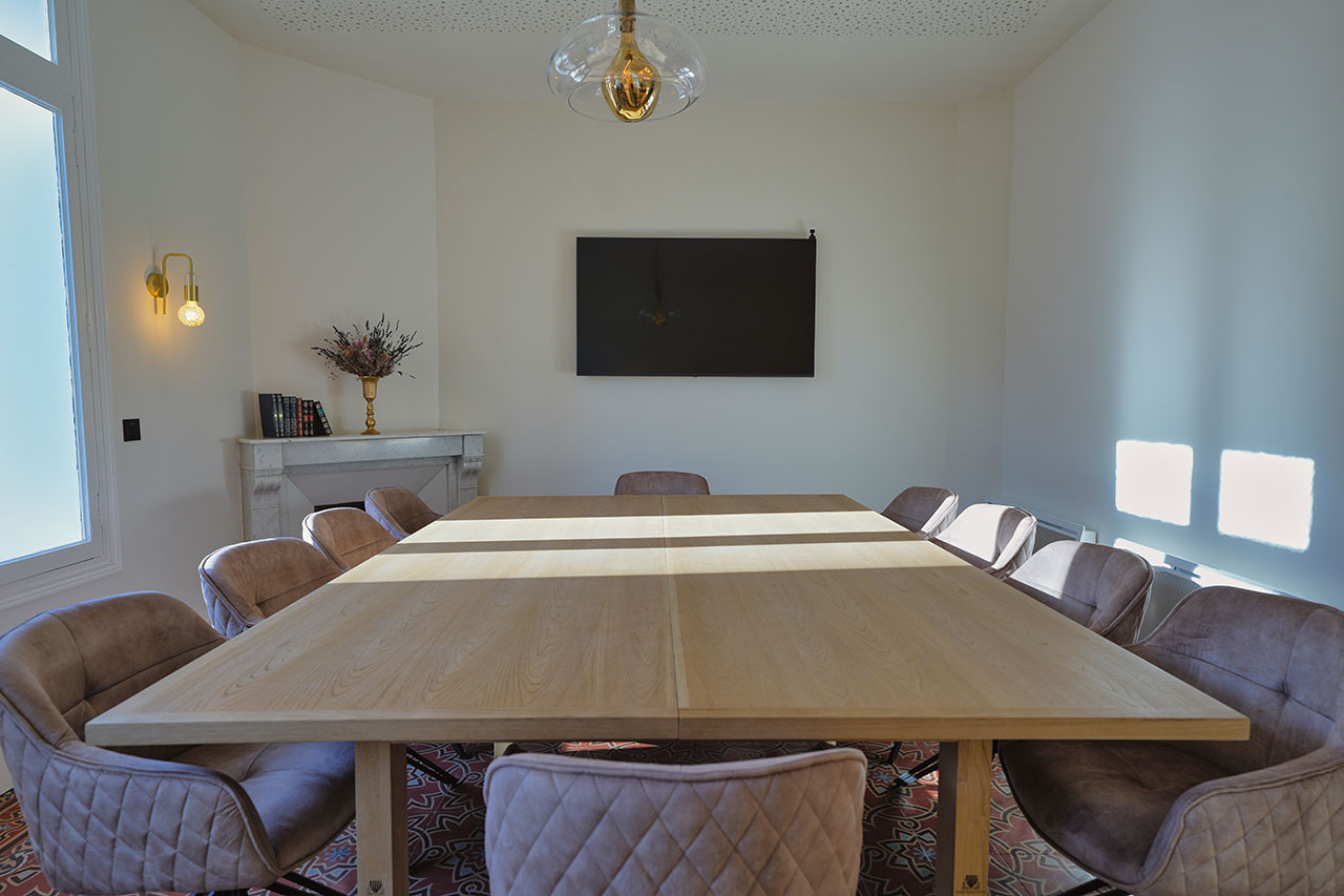 Explora is a bright meeting room open to the park, designed to welcome curious minds and daring groups. With its large central table conducive to debates and decisions, and its high seats set back for observation or quiet time, it embodies a space with variable geometry, where ideas flow freely.